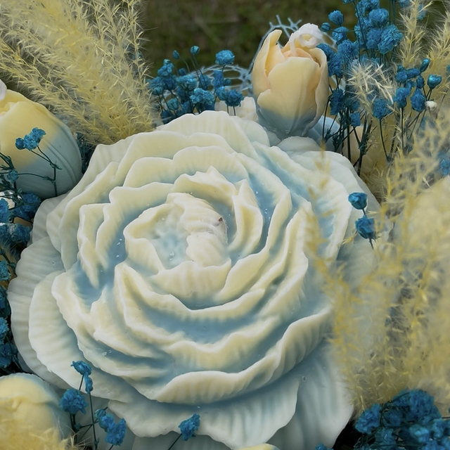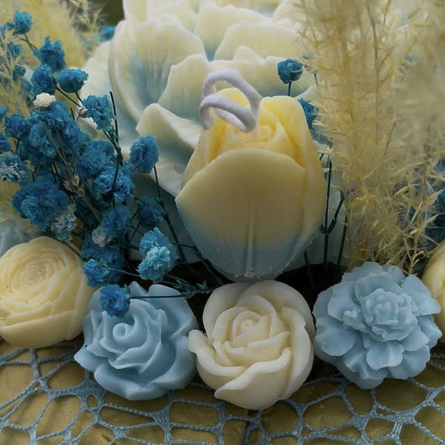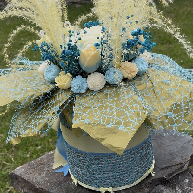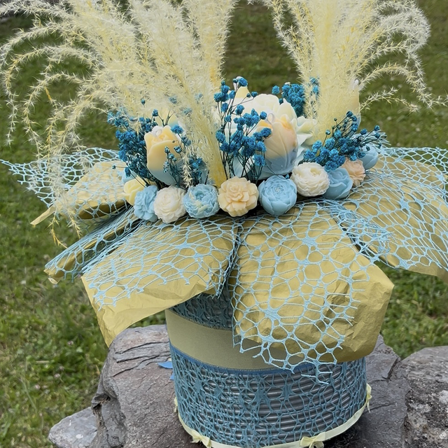 1. Soleil et Ciel". Ce nom reflète les teintes jaunes évoquant la chaleur et la lumière du soleil, combinées aux nuances bleues rappelant le ciel. Cette combinaison de couleurs crée une harmonie joyeuse et apaisante, parfaite pour un bouquet délicat et esthétique.